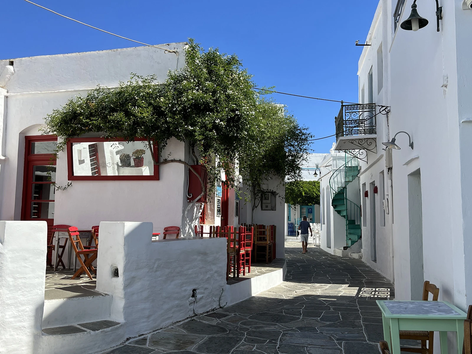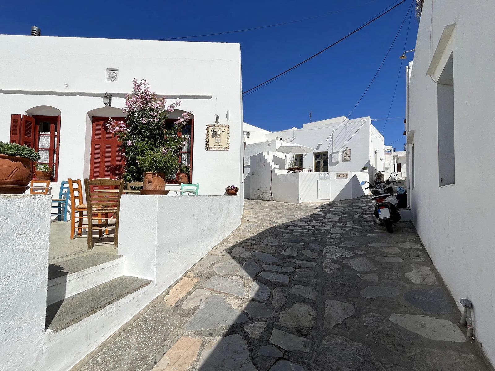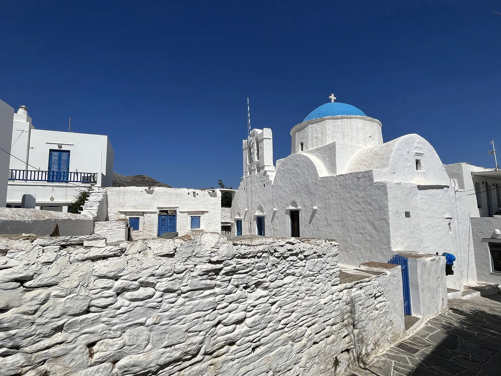 The lovely steno (pedestrian main street) contains many buildings dating from the seventeenth century, all in whitewashed Cycladic style, and is lined with restaurants, cocktail bars, and boutiques, interspersed with historic churches. Some restaurants and bars have roof terraces where you can enjoy your favorite drink under the moonlit sky, gazing out over the houses to the surrounding hills and sea beyond.
